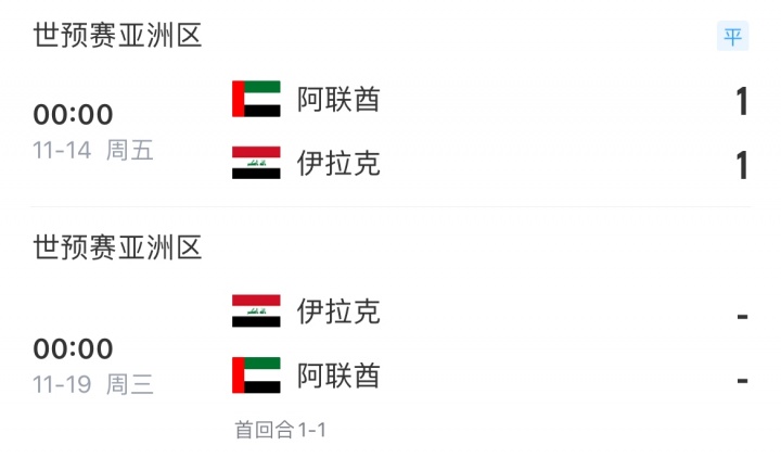 世初赛亚洲区第五阶段首回合,伊拉克与阿联酋1-1战平,来日两边将迎来第二回合的较量。