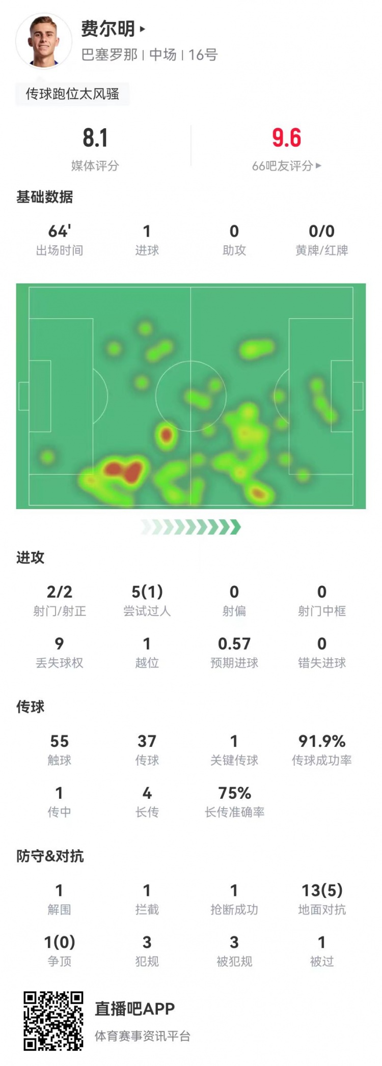 费尔明本场2射2正进1球+1要道传球 14反抗5告捷+3造犯规 获8.1分
