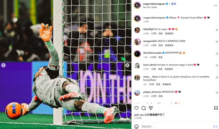 他也在赛后通过社媒晒出我方的多张扑救照,并配文:“哈!💥 永恒佛砸米兰(米兰前进)❤️🖤”