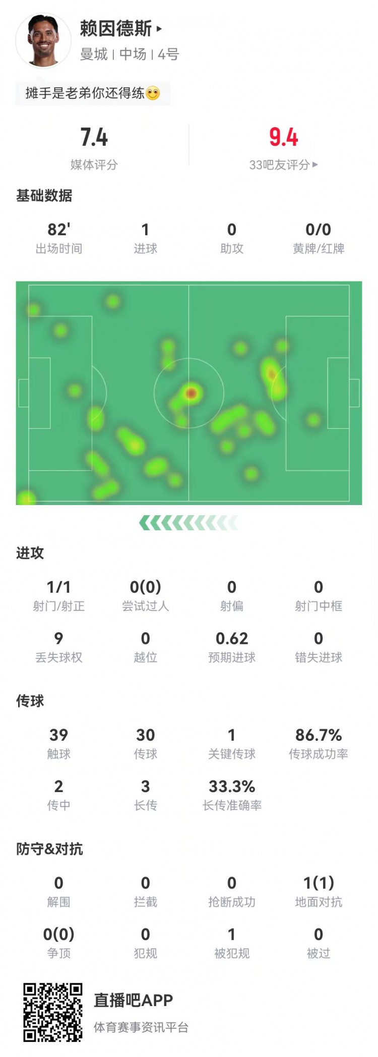 12月3日讯 曼城在本轮英超对阵富勒姆,赖因德斯本场数据如下: