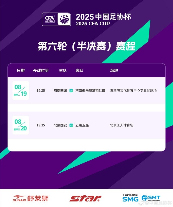 8月6日讯 官方音问,足协杯半决赛期间信托,两场比赛诀别8月19日以及20日进行。