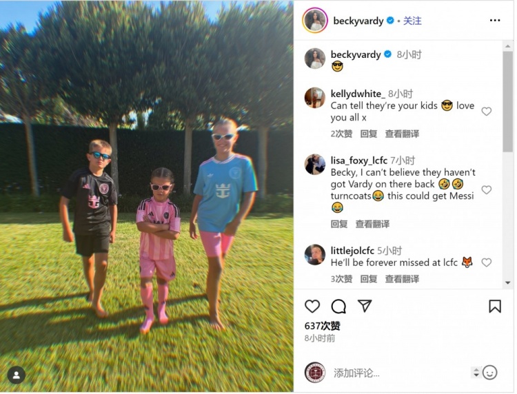 瓦尔迪老婆社媒晒娃,三个孩子皆身穿迈阿密外洋球衣