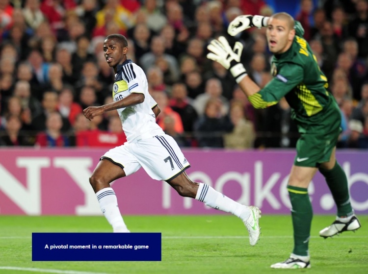 11-12赛季欧冠半决赛切尔西对阵巴萨,首回合蓝军主场1-0取胜。次回合两边在诺坎普张开决战,上半场布斯克茨和伊涅斯塔各入一球,巴萨2-0逾越,总比分2-1反超。而且蓝队伍长特里染红下场。