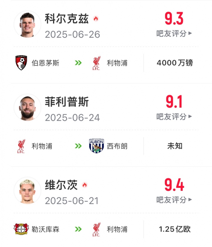 在7月24日利物浦官宣签下埃基蒂克时,驳斥区不少质疑声。吧友们仅给埃基蒂克的转会打出6.3的评分,评分呈现南北极分化趋势,远低于维尔茨的9.4分和科尔克兹的9.3分。