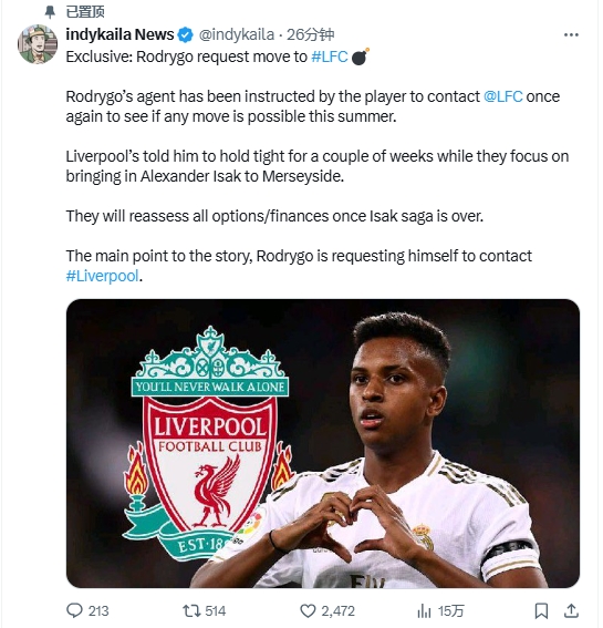 利物浦知名博主indykaila News发布独家音问,罗德里戈央求转会利物浦。不外这个转会点,西班牙约略英国媒体当今还未跟进报说念。