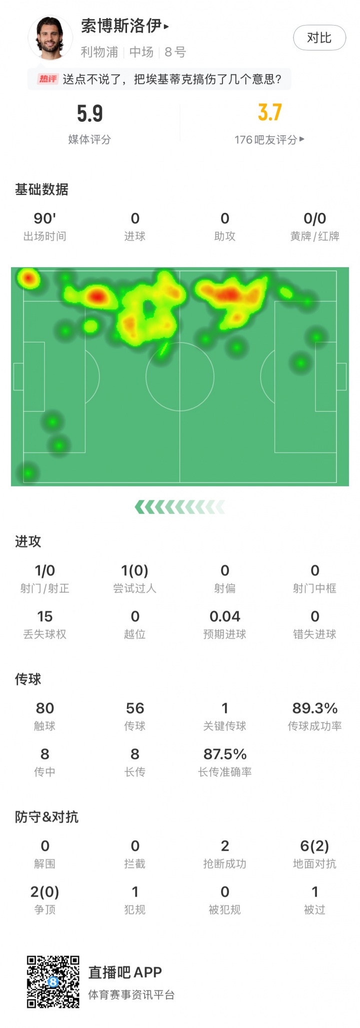 本场比赛索博斯洛伊1次射门无射正,1次过东说念主未见效,56次传球1次重要传球,传球见服从89.3%,6次大地抵抗2次见效,2次争顶无见效。