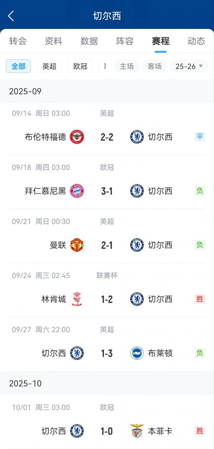 9月进行的各项赛事中,切尔西成绩1胜1平3负,仅在联赛杯中2-1投降了英甲球队林肯城;他们对阵拜仁的欧冠比赛,对阵曼联、布莱顿的英超比赛均不悔怨手。包含周中切尔西1-0本菲卡在内的几场比赛中,蓝军门将桑切斯、后卫查洛巴、时尚佩德罗阔别吃到红牌。