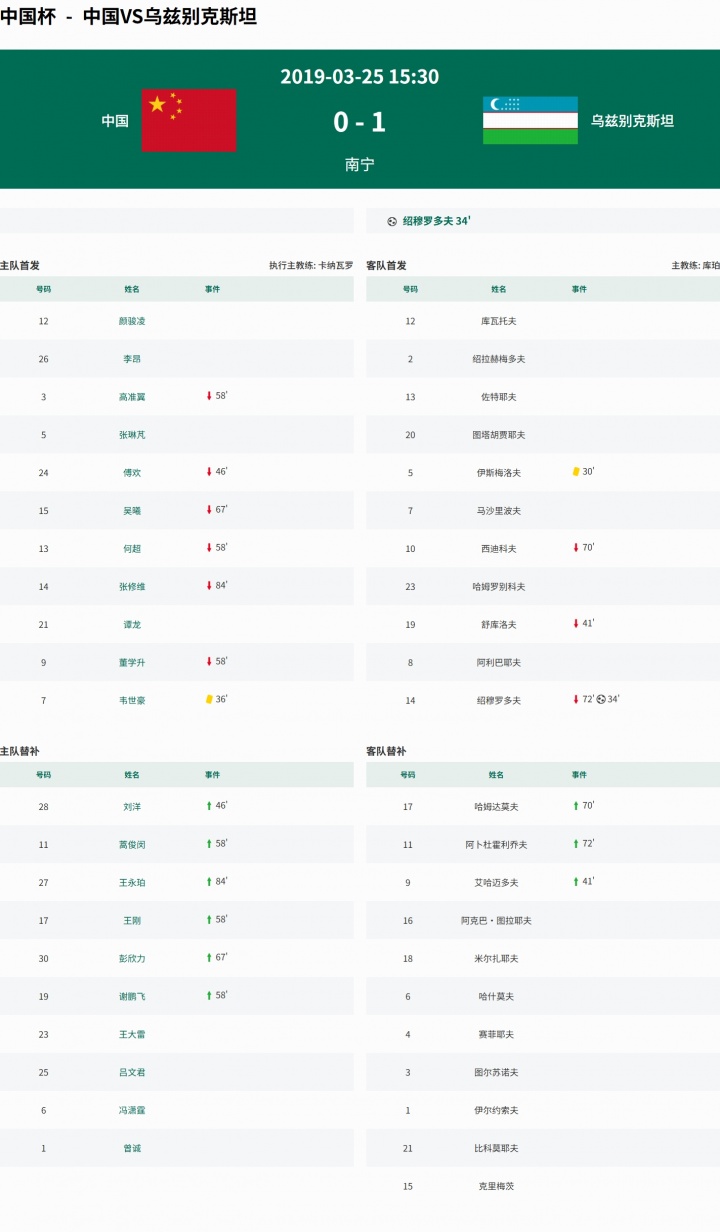 2019年3月25日,第三届中国杯季军争夺战在中国队和乌兹别克斯坦之间进行。上半场国足遑急端毫无亮点,绍穆罗多夫爆射破门,韦世豪调皮飞铲染黄,下半场对方错失屡次良机。最终国足0-1不敌乌兹别克斯坦,当届中国杯两连败且一球未进,排行垫底。