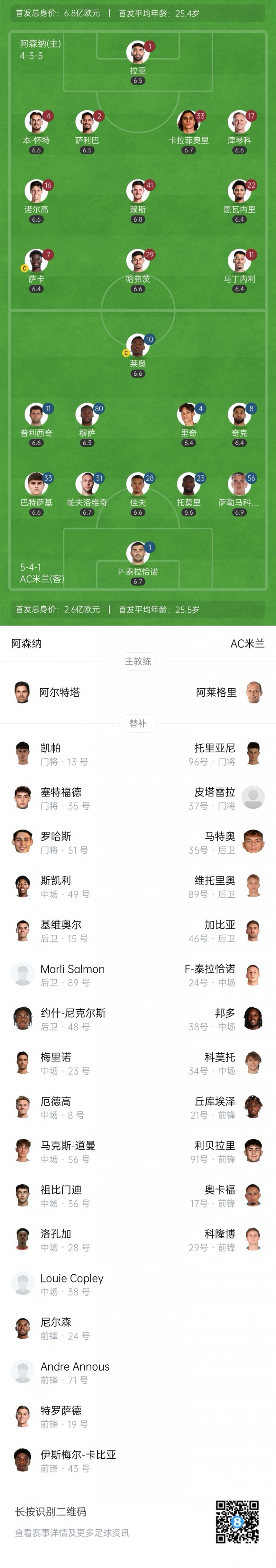 阿森纳替补:13-凯帕、35-赛特福德、51-阿列克谢-罗哈斯、48-尼科尔斯、15-基维奥尔、89-萨尔蒙、49-刘易斯-斯凯利、36-祖比门迪、28-洛孔加、38-路易-科普利、23-梅里诺、56-谈曼、8-厄德高、43-卡比亚、24-内尔森、19-特罗萨德、71-安努斯