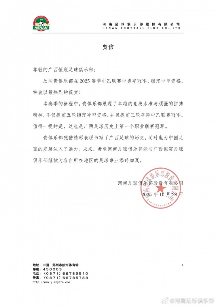 欣闻广西恒宸勇夺中乙联赛冠军,河南俱乐部特致以最浓烈的祝愿