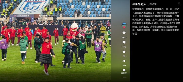 李昂在个东说念主微博写说念:冠军球迷们。亲爱的海港球迷们,晚上好,时光飞逝要跟全球说重逢了,很走时能成为海港的一份子,是你们再次让我感受到了家的虚心,还有优秀的队友,教悔,使命主说念主员是你们让我在海港的五年时光里获取4个冠军,我的家东说念主也在上海感受到了家的虚心,我会恒久记着这段好意思好的经验,祝福你们异日一切顺利,我会恒久是海港的球迷。