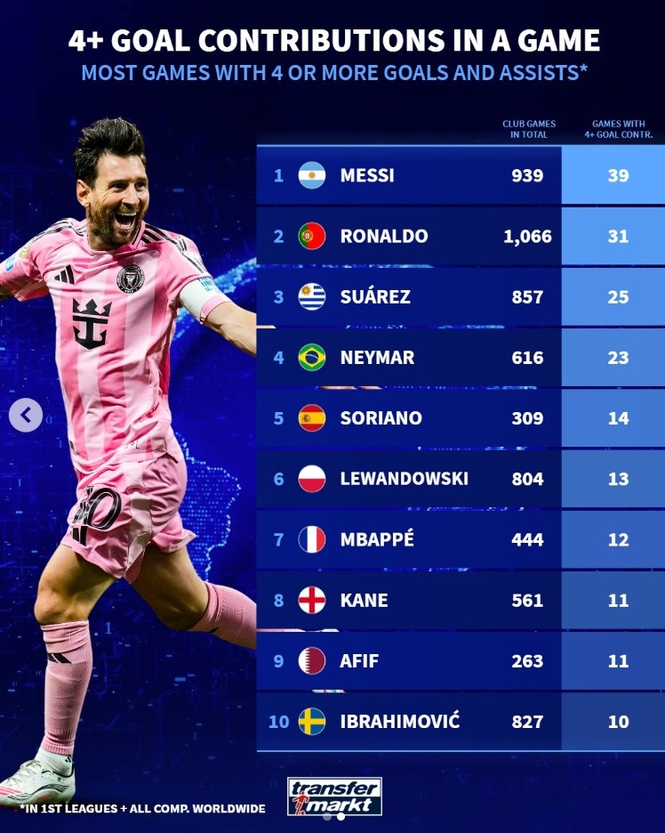 11月24日讯 迈阿密国外皮当天季后赛4-0完胜辛辛那提FC,梅西1射3传独造4球。《转会市集》数据统计袒露,梅西亦然俱乐部层面单场参与进球4+次数最多的球员。
