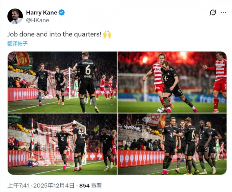 凯恩社媒晒出比赛相片,庆祝球队晋级,配文:“任务完成,晋级8强!”