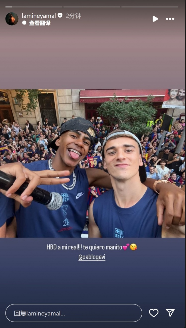 8月5日讯 亚马尔更新社媒动态,祝队友加维寿辰粗糙。