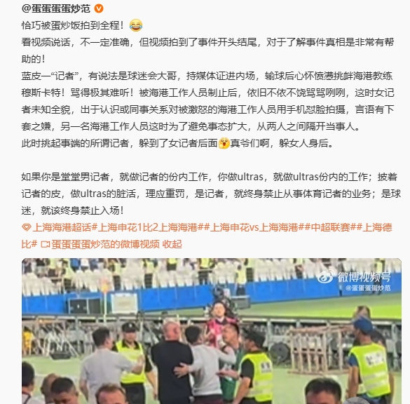 昨晚进行的中超第20轮焦点战,上海申花1-2上海海港,赛后一段视频在网崇高传,包括穆斯卡特翻译在内的海港责任主谈主员与申花记者许玥发生争握。