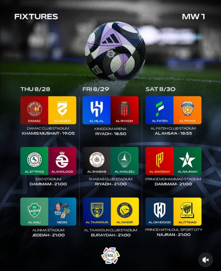 8月13日讯 新赛季沙特联将于本月底拉开帷幕。沙特联官方公布了2025/26赛季首轮9场比赛的比赛时候,具体如下(时候换算为北京时候,主队在前):