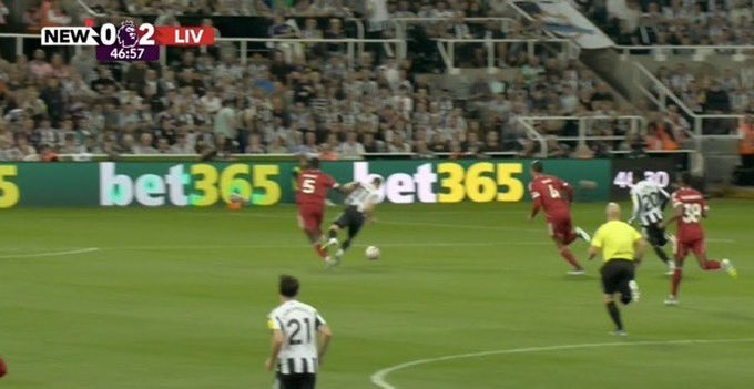 这一画面发生于第47分钟,那时利物浦多打一东谈主2-0晋升。纽卡反击,巴恩斯前插,科纳特补防,前者倒地,裁判未吹罚,VAR未介入,吉马良斯抗议判罚因此吃到黄牌。