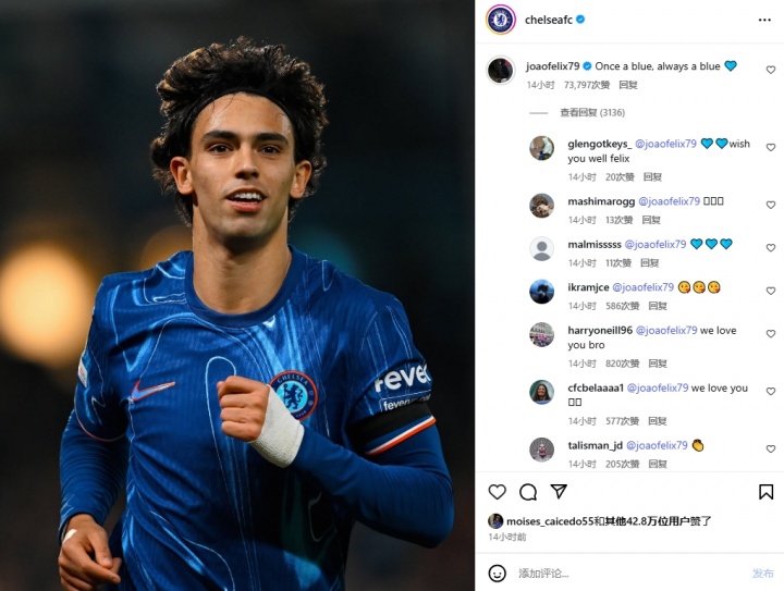 菲利克斯在琢磨区留言:Once a blue, always a blue 💙(一日蓝军,毕生蓝军💙)