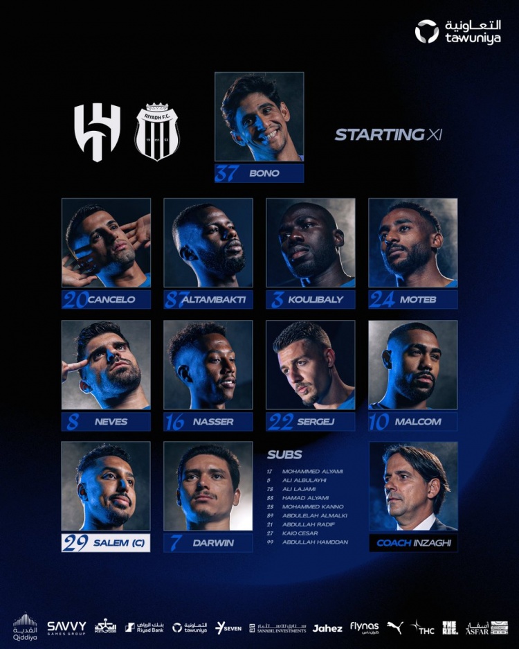 利雅得月牙首发:37-布努、20-坎塞洛、87-坦巴蒂、3-库利巴利、24-穆塔卜-哈尔比、8-鲁本-内维斯、16-纳赛尔-多萨里、22-米林科维奇、10-马尔科姆、29-萨利姆-多萨里、7-努涅斯