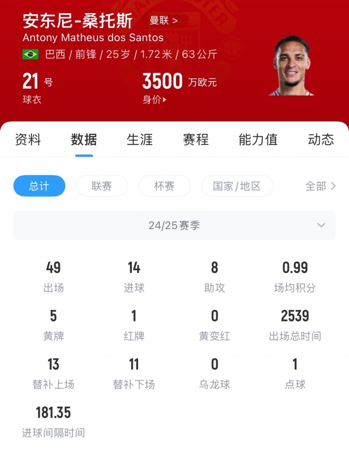 25岁的安东尼2022年8月加盟曼联,总价9500万欧。效劳曼联于今,球员出战96场得益12球5助。