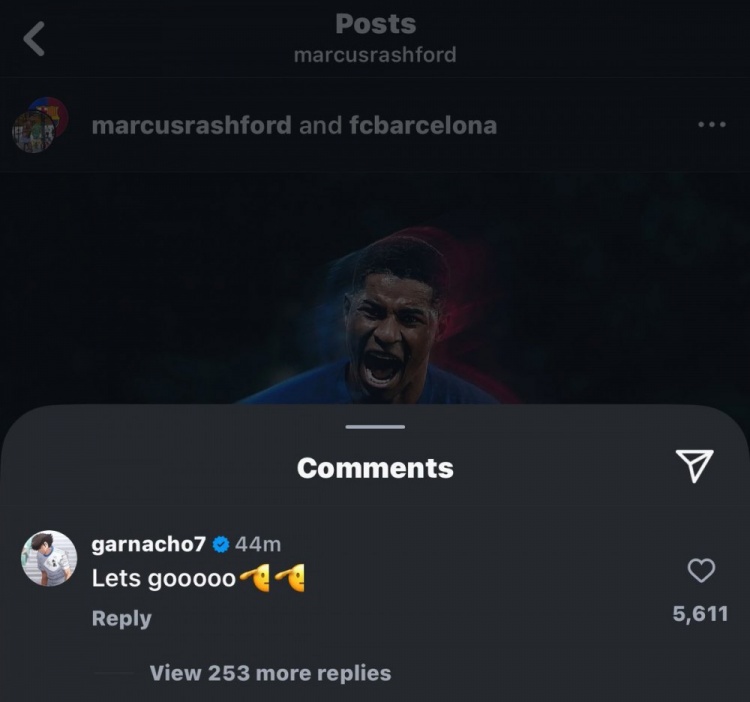 加纳乔在拉什福德官宣社媒下留言谈:“Let’s go!(直译为“让咱们启航”,也可意会为“冲啊!加油!”)🫡🫡”并配上了“敬礼”颜料。