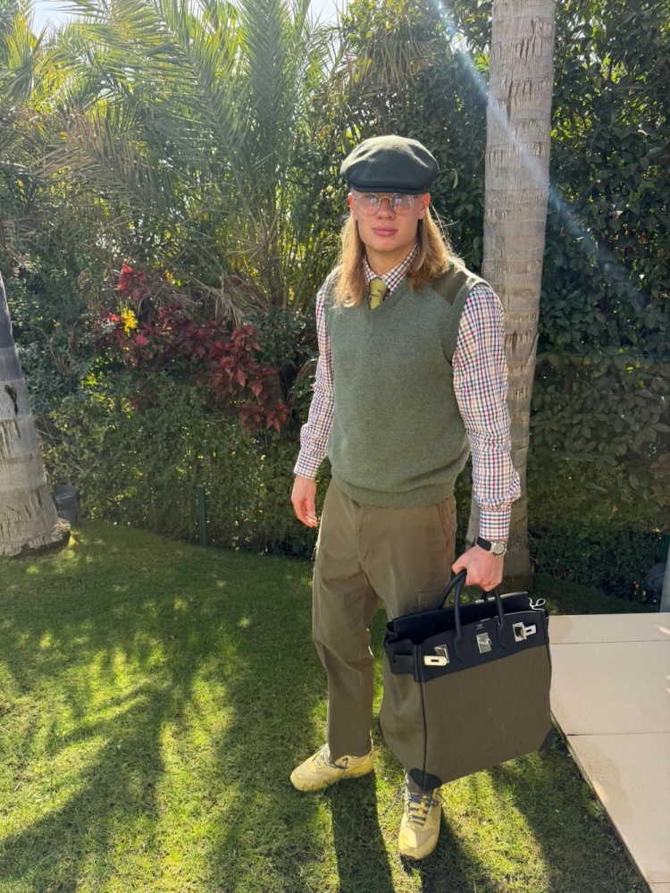 哈兰德社媒晒出穿搭像片,配景是邑邑芊芊的绿色植被,哈兰德头戴绿色帽子,身上一稔绿色马甲,内搭格子衬衫,下身一稔橄榄绿裤子,手拎黑绿色帆布包包。