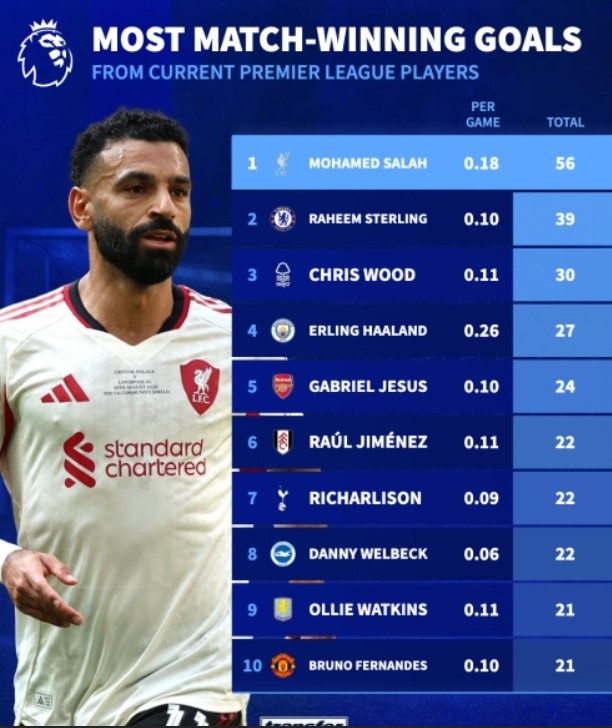 10月18日讯 德国转会市集盘货了现役英超球员打进制胜球名次情况,萨拉赫以56球遥遥朝上,斯特林以39球位居次席。