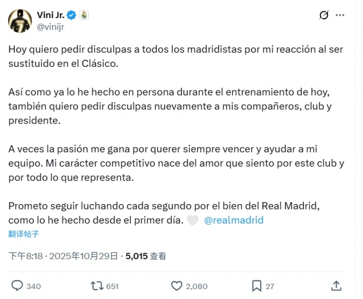 10月29日讯 维尼修斯在国度德比中,因不悦被换下,直接走回更衣室。本日,维尼修斯社媒就不悦被换下向皇马球迷、队友、俱乐部和主席致歉。