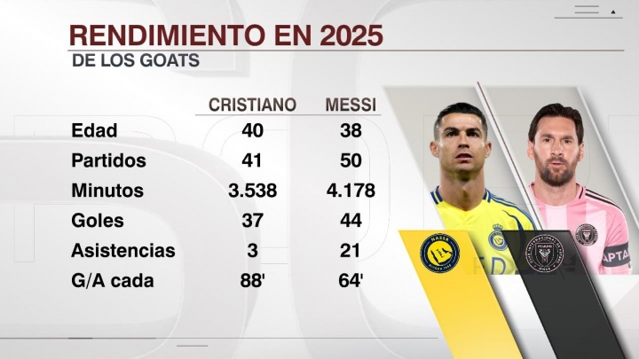 梅罗本年数据:梅西50场44球21助,C罗41场37球3助