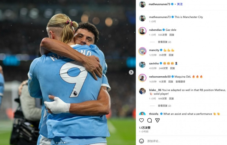 精确制导连线哈兰德!努内斯社媒晒两东谈主相拥庆祝照:这便是曼城!