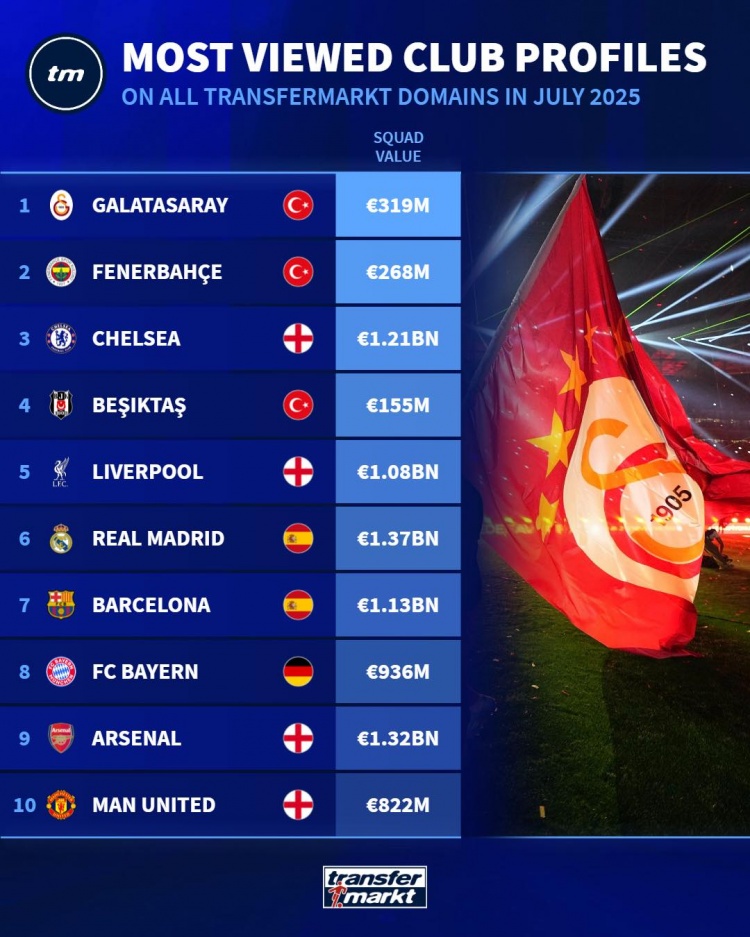 8月3日讯 德国转会市集统计了球员、俱乐部尊府7月份的浏览量,比肩出榜单,球员方面奥斯梅恩居首,俱乐部方面加拉塔萨雷夺魁。