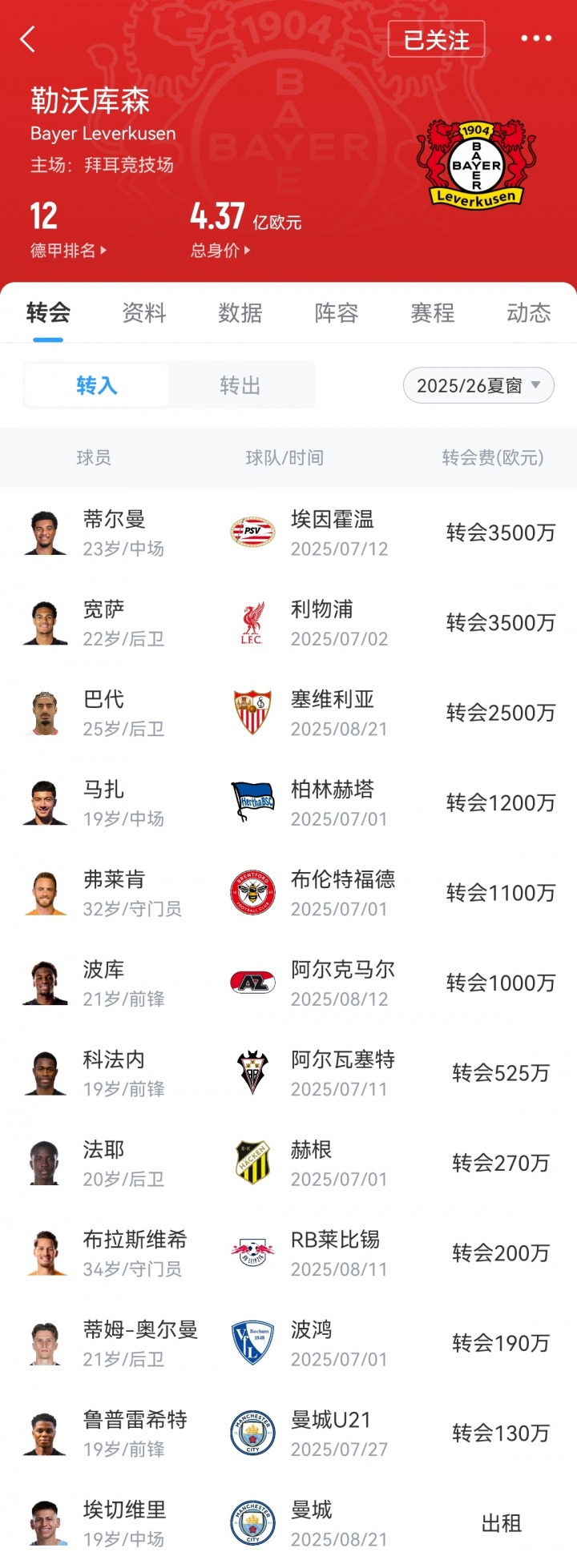 这位34岁球员以摆脱身加盟,其在皇家马德里的协议已于上赛季末到期。巴斯克斯在德甲俱乐部签下了一份法例2027年6月30日的协议,他将在药厂队身披21号球衣。