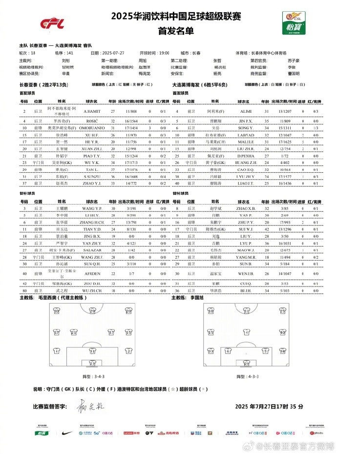 长春亚泰vs大连英博首发出炉,为长春咱们所有斗争