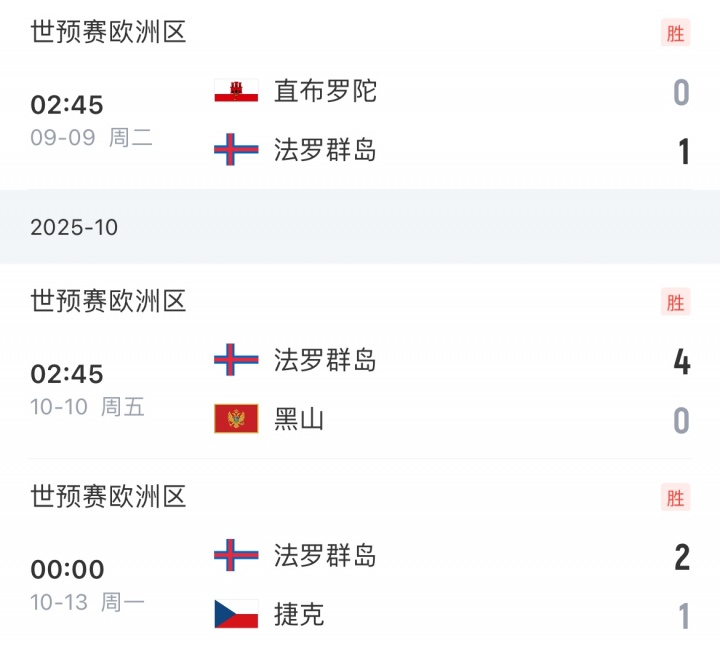 世初赛赛场,法罗群岛当今已达成3连胜,先是客场1-0驯顺寰宇第200的直布罗陀。随后说合两场以下克上,主场先后4-0寰宇第80的黑山和寰宇第39的捷克。
