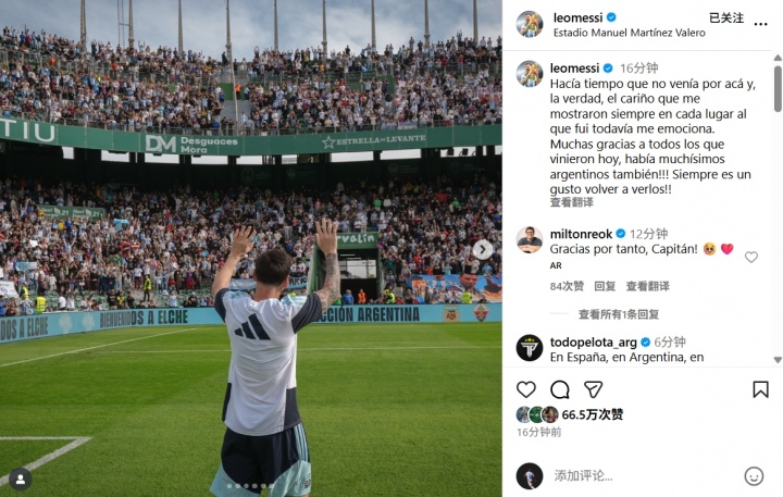 11月13日讯 梅西发布社媒,感谢了今天在埃尔切不雅看我方考研的球迷们。