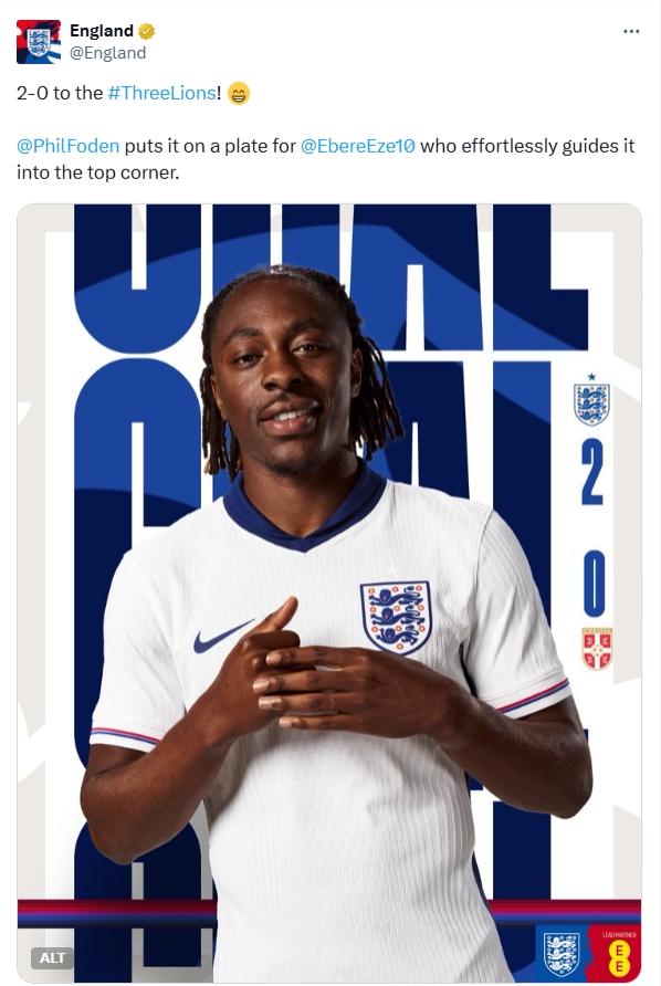 英格兰2-0打败塞尔维亚,埃泽在第90分钟破门锁定胜局,英格兰队官方的进球刻画却激励了一众英国球迷的吐槽。