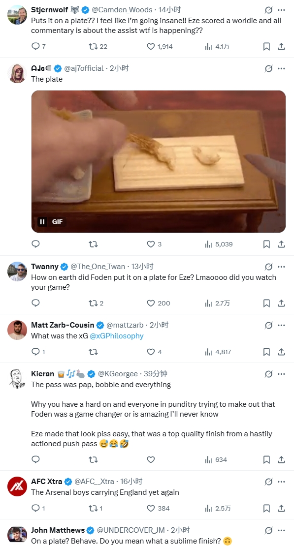 英格兰官方在播报进球时写说念:“三狮军团2-0朝上!福登将球喂到嘴边,埃泽绝不冗忙地将球送入上角。”