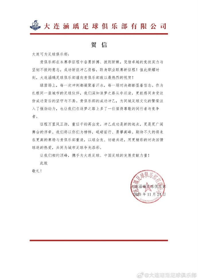 大连可为官方写谈:感谢同城兄弟球队大连英博足球俱乐部 、大连鲲城足球俱乐部 、大连涵瑀足球俱乐部发来的贺信。2026赛季,大连可为手脚行状联赛的新军,向英博、鲲城两位老老迈学习,期待咱们一王人生机勾通,雕刻前行!祝贺大连涵瑀概况在附加赛中脱颖而出,来岁再续德比荣光!