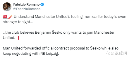 罗马诺暗示,曼联折服塞斯科只思加盟老特拉福德,他们已向球员冷落了细腻合同报价,同期也在和莱比锡谈判。