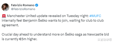 固然纽卡9000万报价比曼联的8500万报价要高,但球员的魄力才是转会要津。今晨,名记罗马诺和Ben Jacobs说明,塞斯科今晚再次标明思去曼联,曼联今晚对签下他变得更有信心。