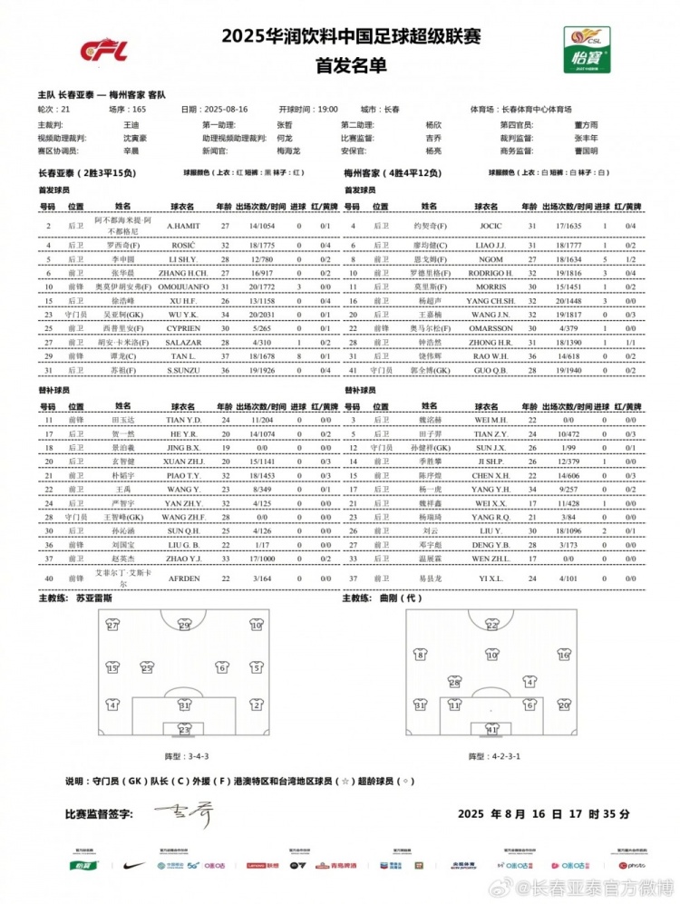 长春亚泰vs梅州客家首发出炉,为长春咱们一说念战争