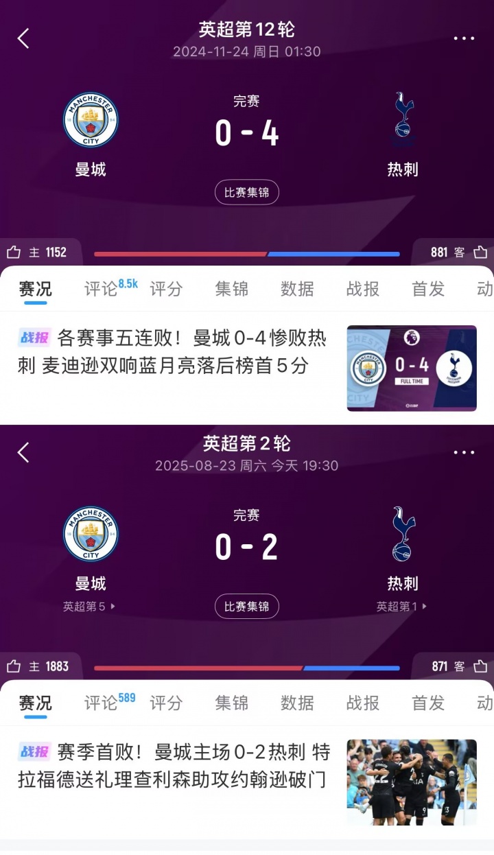 08月23日讯 曼城主场0-2不敌热刺,热刺开赛2连胜暂登顶。热刺不竭2场作客伊蒂哈德主场获取得手,不竭2场零封轰6球。