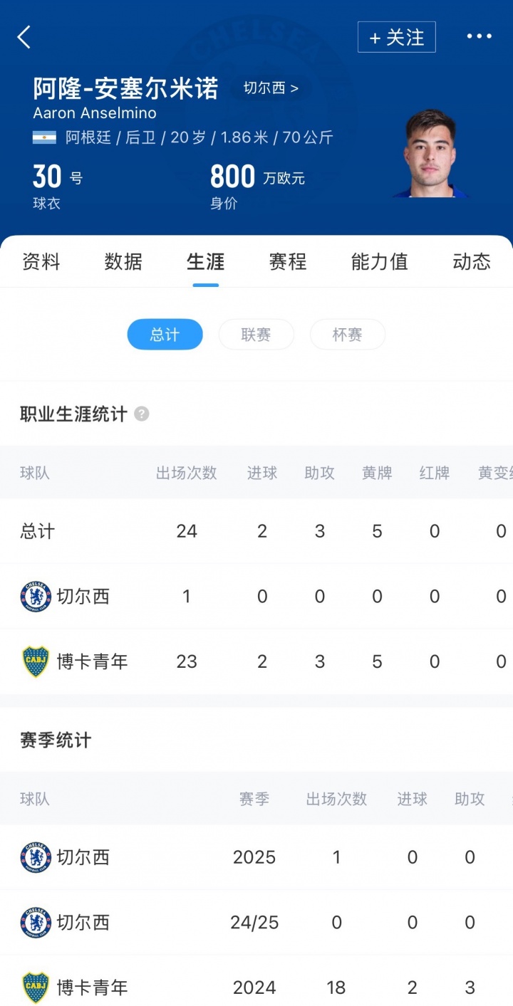 20岁的安塞尔米诺是切尔西昨年夏窗从博卡后生签下的球员,他在今夏随切尔西获取世俱杯,仅代表切尔西出场过1次。