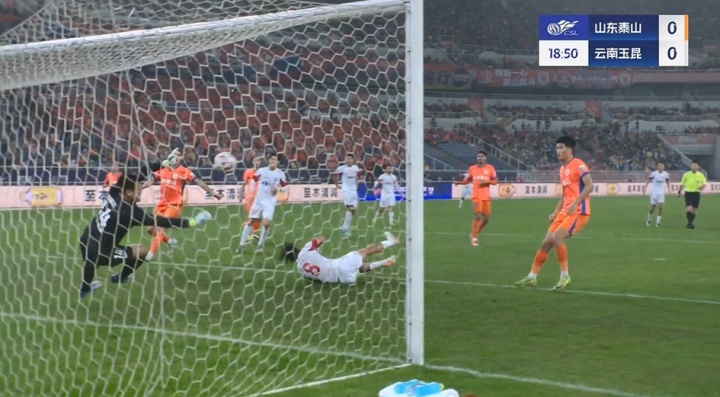比赛第18分钟,玉昆边路起球传中,叶楚贵近距离头球攻门被王大雷挡出。
