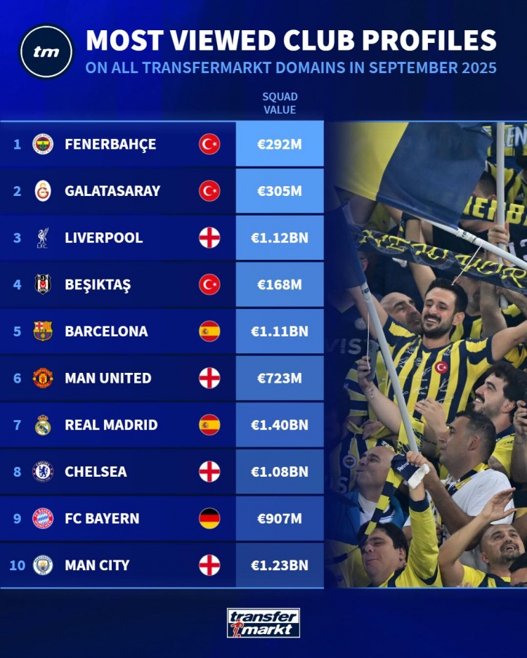 10月5日讯 德国转会市集列出了9月份球员页面浏览量排行,C罗居首,埃德森、京多安二三位,梅西排行第7位。