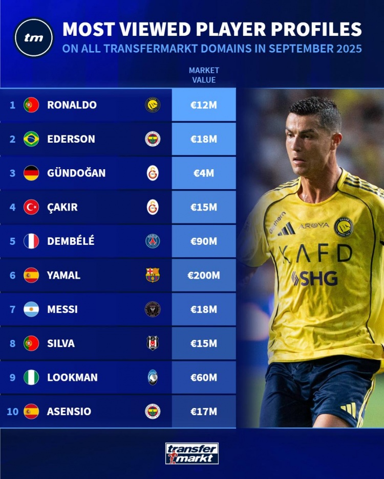 德转球员页面9月浏览量排行:C罗居首,埃德森第二、梅西第七