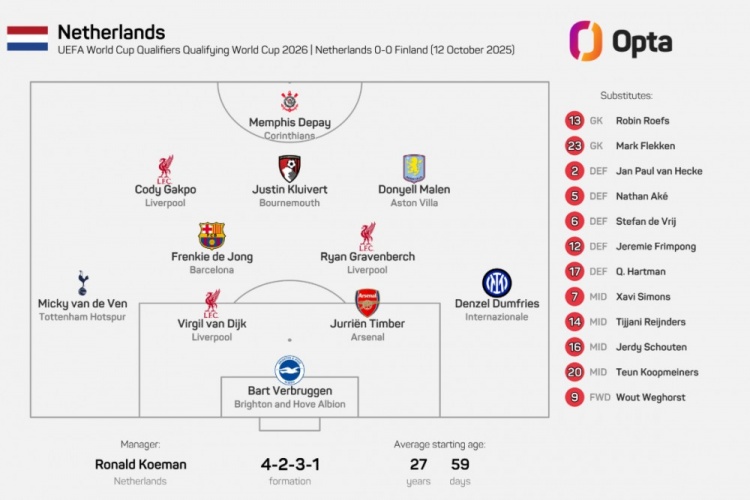 10月13日讯 世初赛欧洲区小组赛,荷兰在主场迎战芬兰。本场比赛,荷兰再次排出了莫得任何又名荷甲球员的首发声威,这是橙衣军团本年第5次作念出如斯安排。此前,荷兰国度队扫数年份莫得排出荷甲球员的首发声威也仅有5次良友。