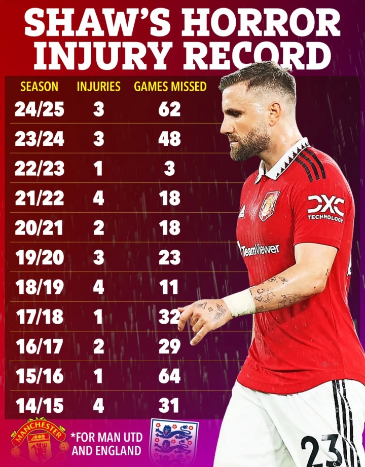 卢克-肖遥远饱受伤病困扰,《太阳报》清点了他在曼联的伤病史,11个赛季里,他一共伤缺了339场比赛。上赛季,卢克-肖因小腿受伤,悉数只为曼联出战了12场比赛,操办出场技艺不到600分钟。
