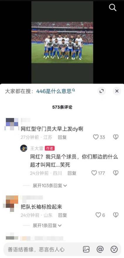 截图中不错看到,王大雷在短视频软件上晒出了我方的比赛像片,随后有一位IP是江苏的网友辩驳:“网红型守门员大早上发dy啊”。